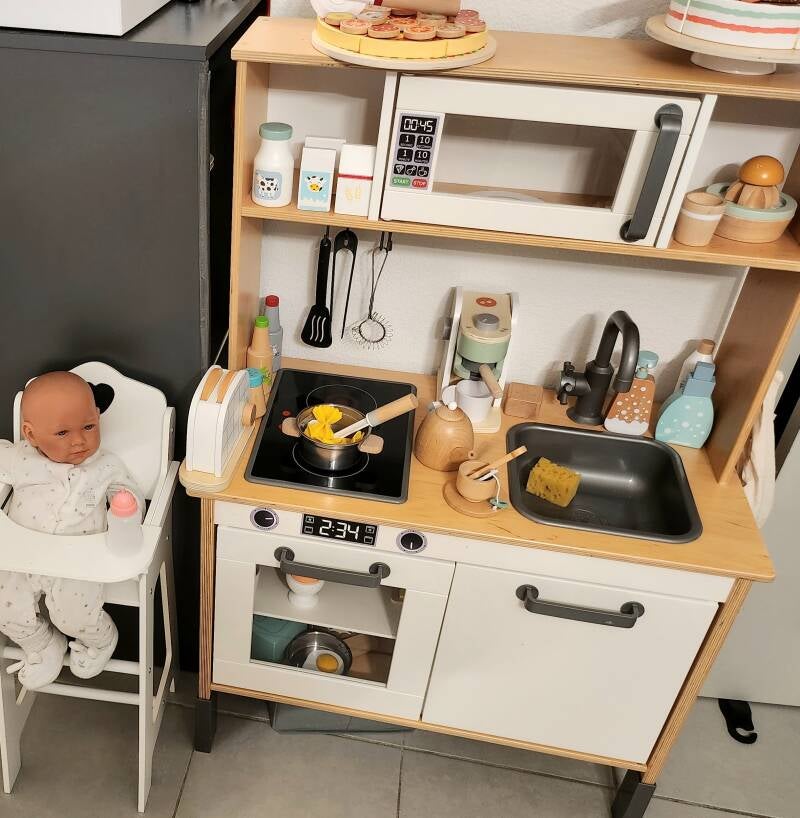 Dans la pièce de vie une cuisine avec toute la dînette comprise y est installé ainsi que des poupons, poussette, chariot ménage, bricolage.